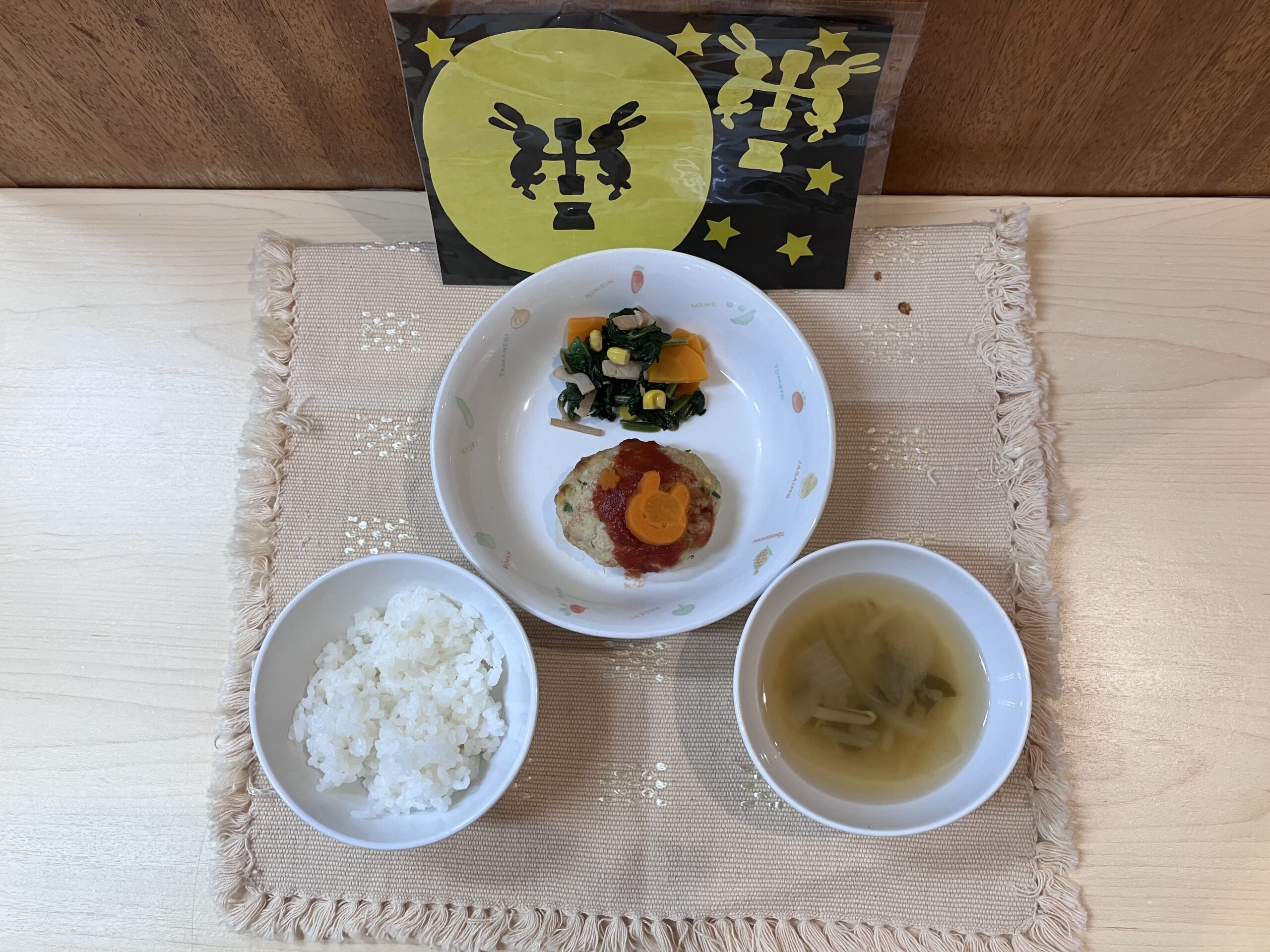 本日は、十五夜ということでお月見メニューを提供しています。 ・ごはん ・お月見ハンバーグ ・ほうれん草の彩りサラダ ・わかめのみそ汁 うさぎ型にした人参を見て、「うさぎ人参おいしい!」「かわいくて食べれない […]