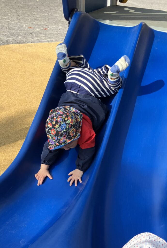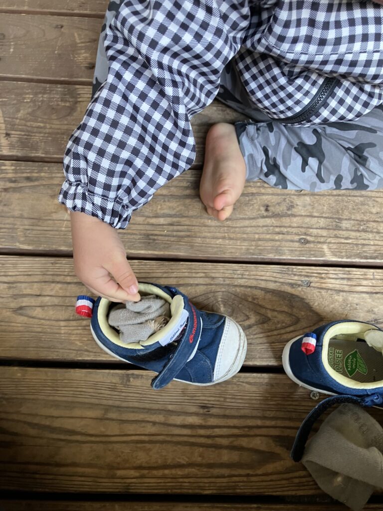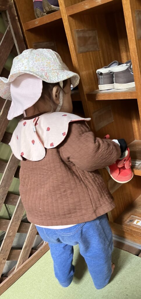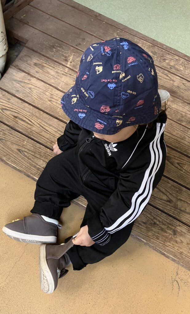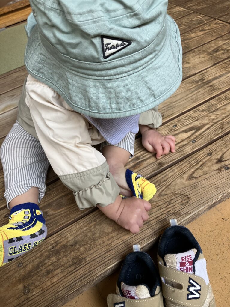毎日お散歩に行く繰り返しの中で、自分で積極的に靴と靴下を手に取って履こうとする・脱ごうとする様子が見られます。