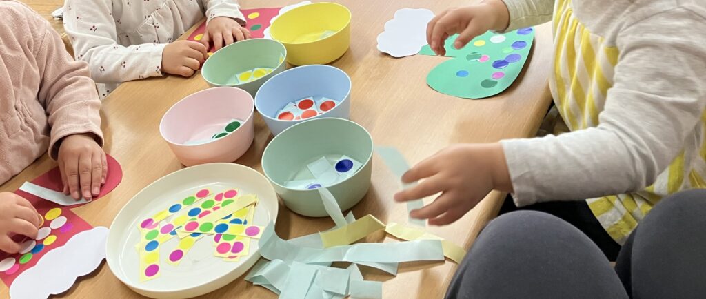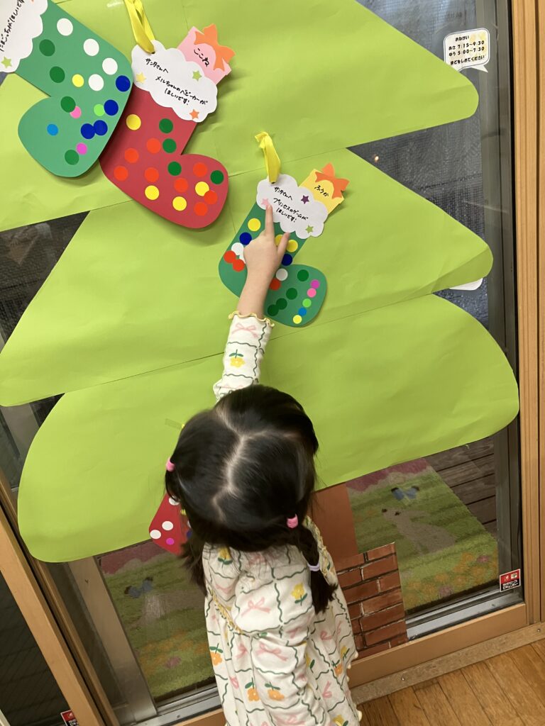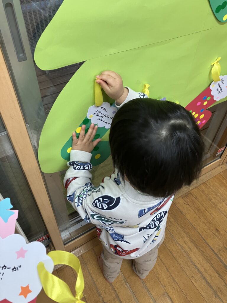 飾りたい場所に飾り、「私は~○○が欲しいんだ~!」「ぼくは~」とお友だちや保育者との会話を楽しんでいましたよ😊