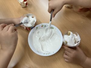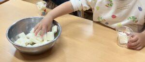 食パンをぎゅっと押すと沢山入るよ!とこそっと話すとぎゅうぎゅう詰めに入れる子や「ここまでで大丈夫」と自分の食べられる量を考えて控えめな子もいました😊