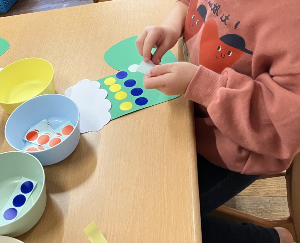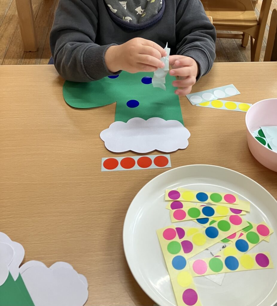 クリスマスブーツに好きな色のシールを貼っていきます🎵