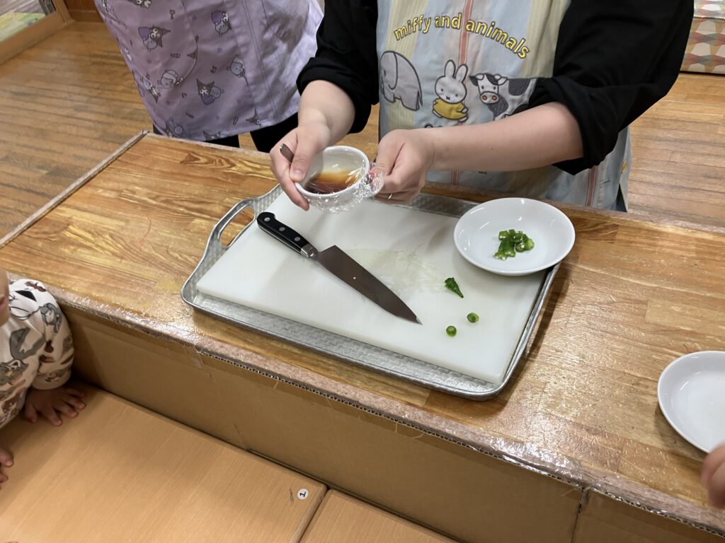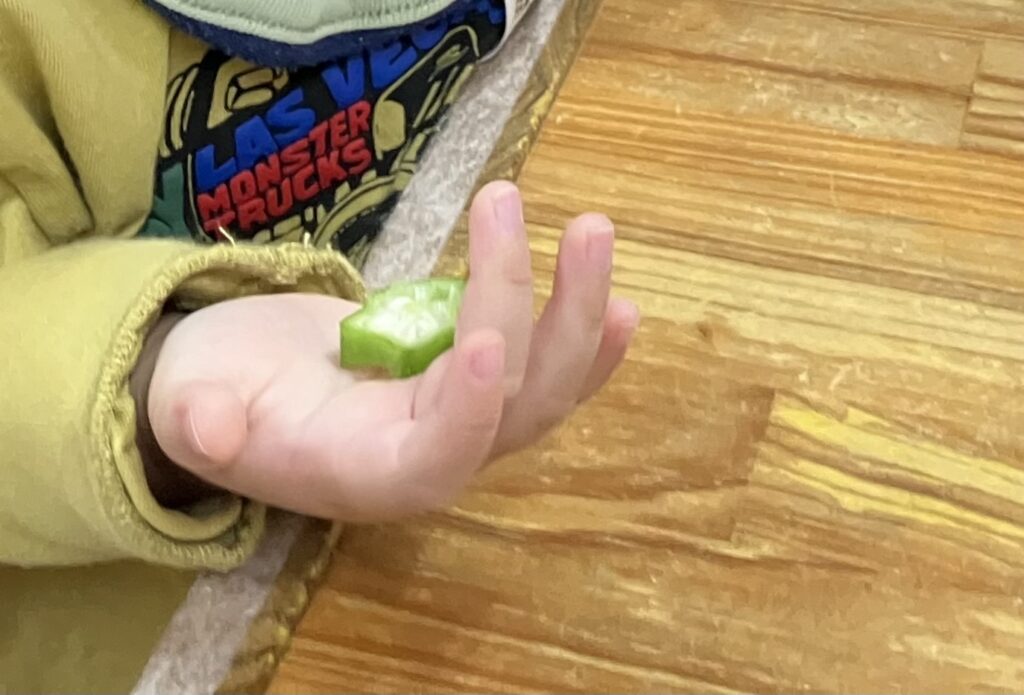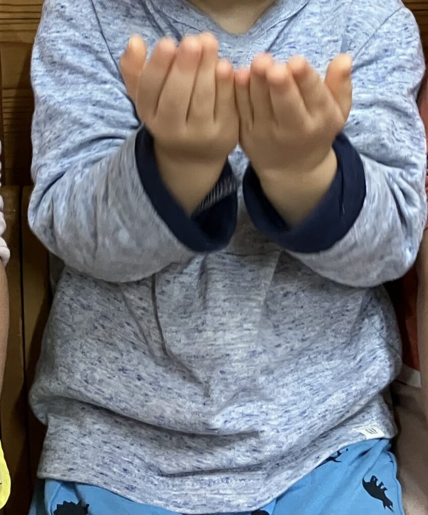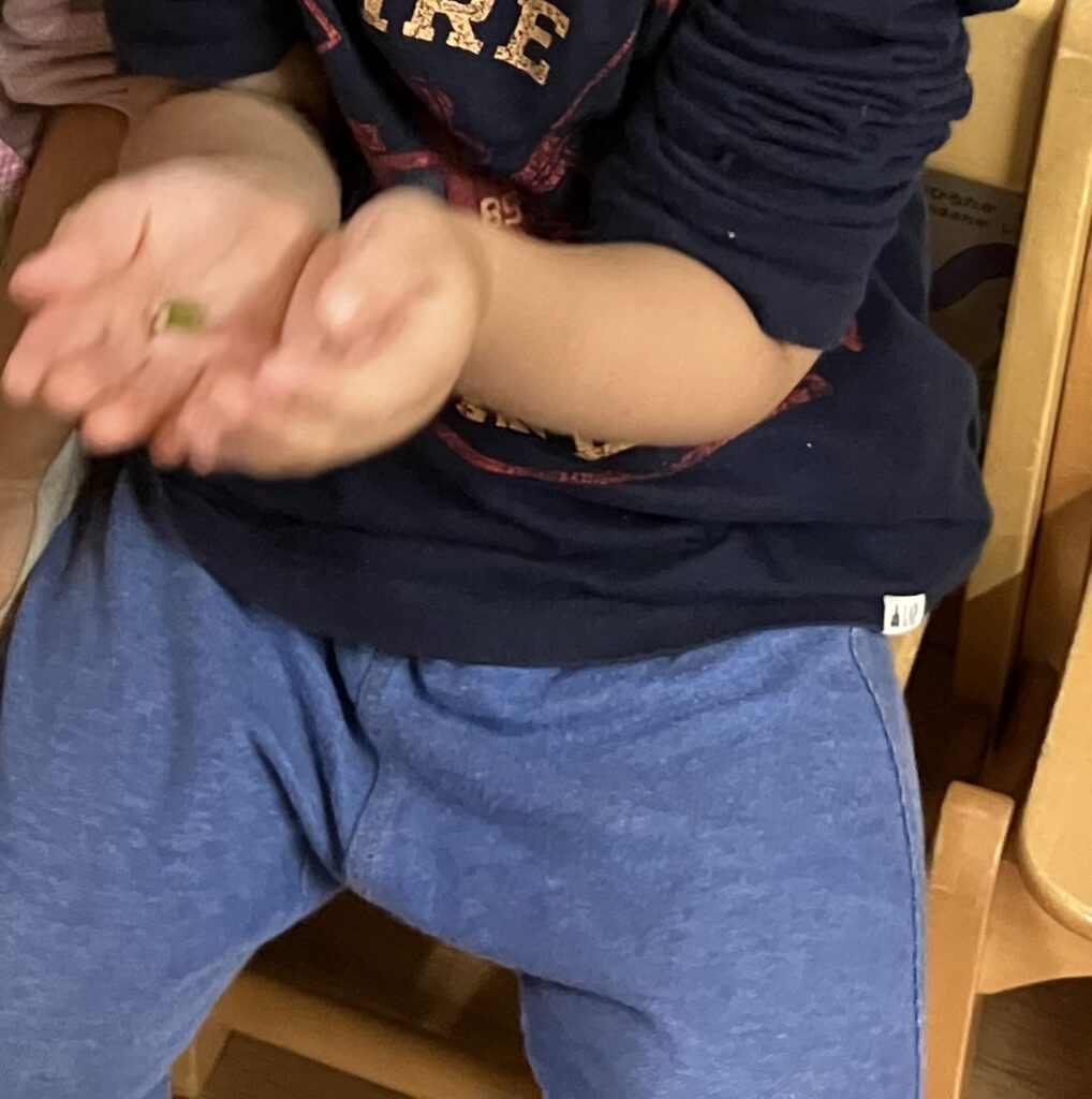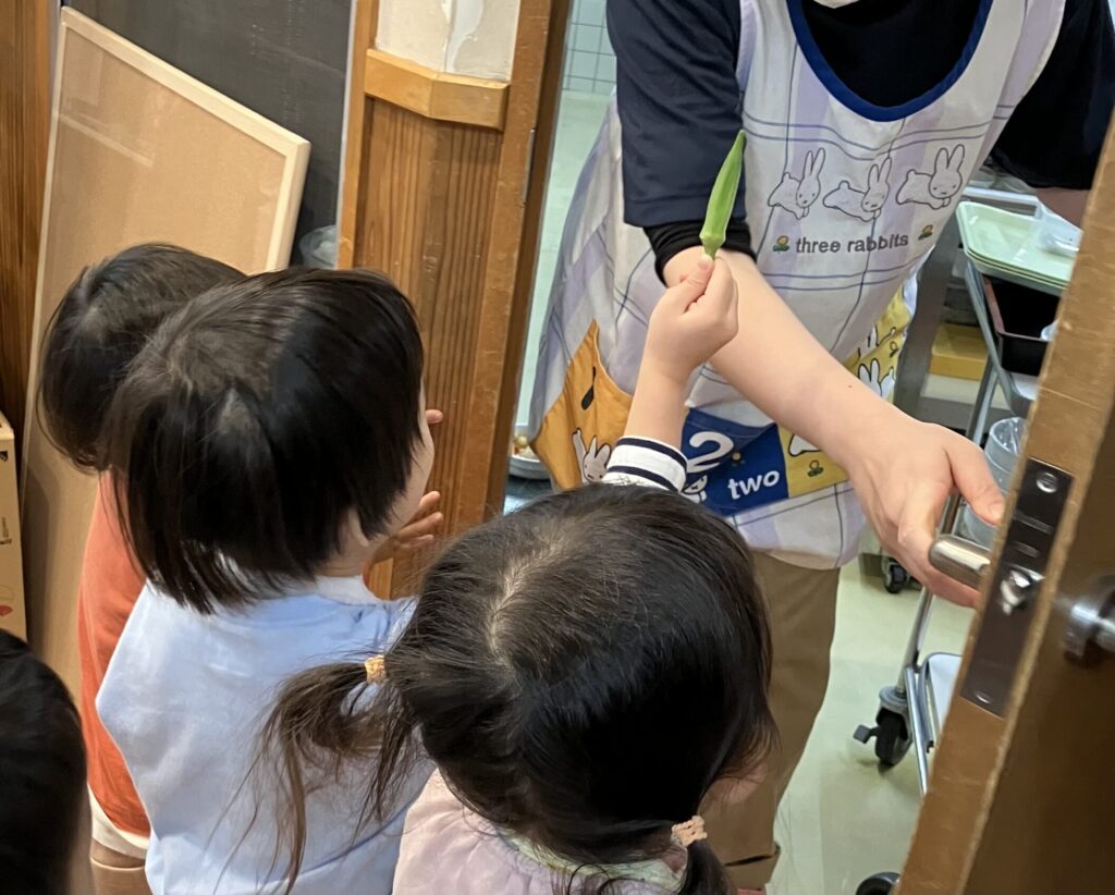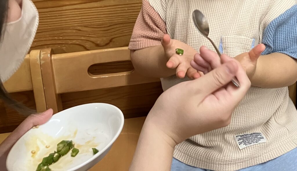 保育者が手にオクラを乗せてくれるまで両手をお皿にして待っている姿も可愛らしかったです🥄💖