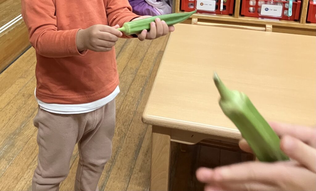 輪切りに切ってみると大きいオクラはあまりネバネバ感が無く種を採ったり、「おほしさま~!」と言って保育者に見せてくれましたよ🤩
