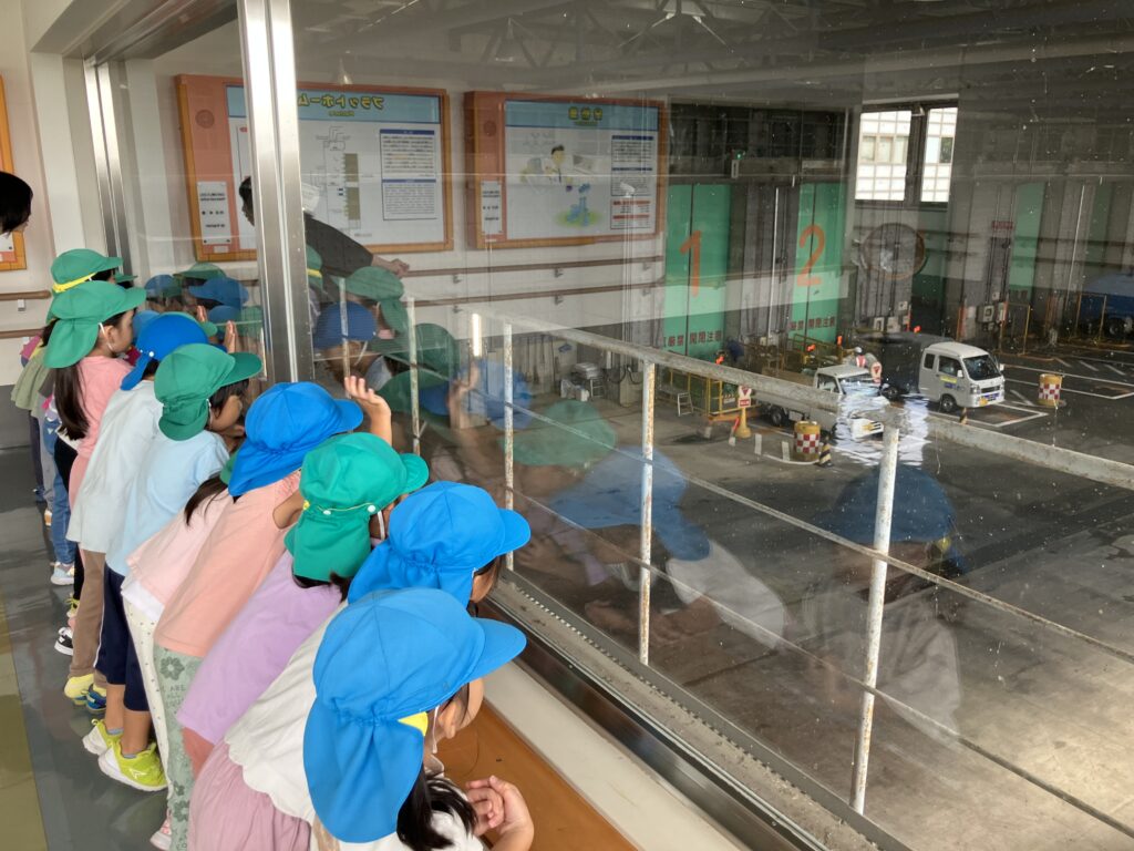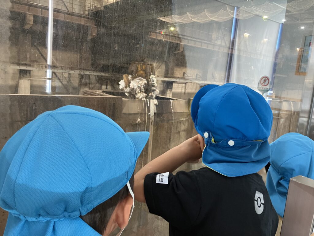 見学はにじ、ほし2グループに分かれて行いました。プラットフォームでは燃えるゴミを回収し終えた清掃車が次々とゴミを降ろしていきます。「あっまたきた!~番に行った!」と様子を夢中で見ていると2番ゲートに来た清掃車がゴミを降ろした後に清掃員の方が大量のゴミの中身を確認していました。すると・・・小さな瓶を一つ見つけ分別していました。その姿を見て「あんな小さな瓶を見つけるのすごい!」と感心していました😊
