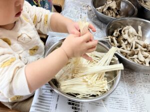 実際にきのこに触れて手でほぐし、色や形、匂いを感じながら