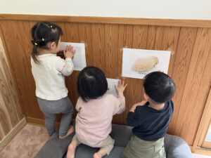 食育後も、壁面に貼ったきのこの写真を見つめながら「きのこ!」「きのこしたよ!」と