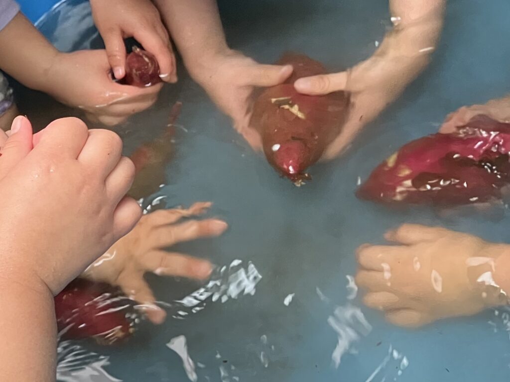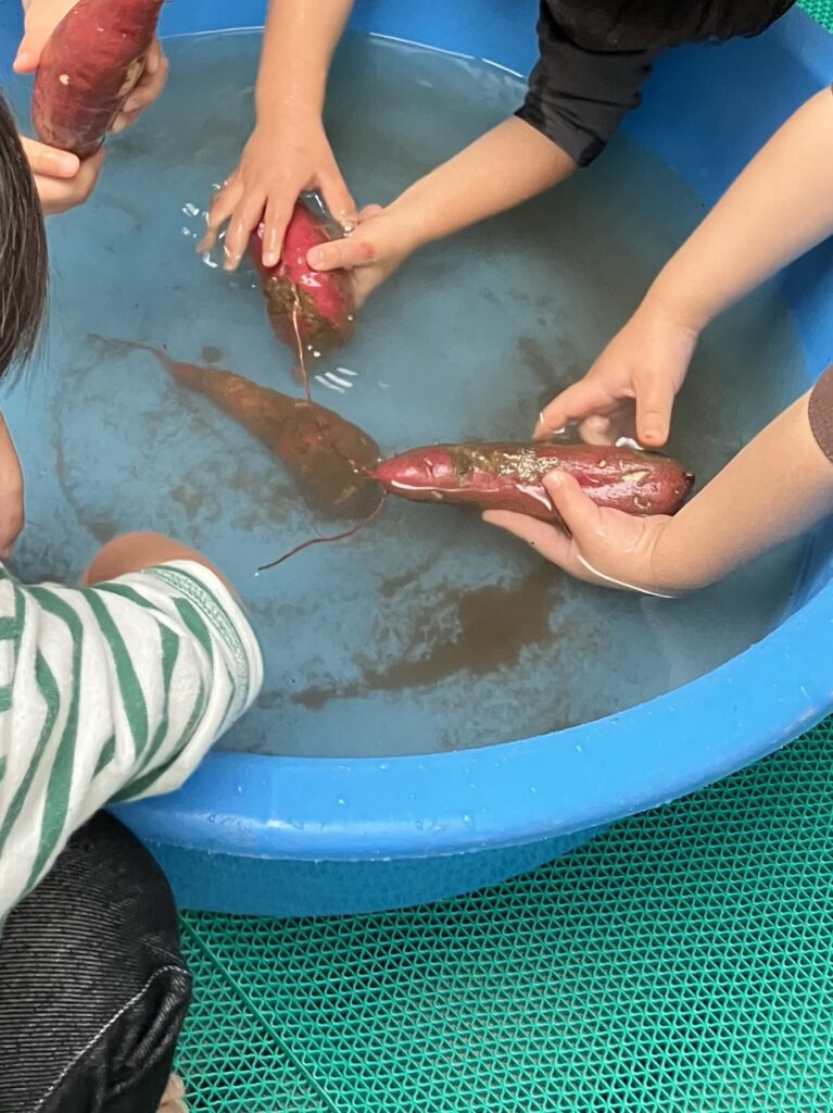 どんどんあらっていくうちに水が汚れていくと「きれいになってきた✨」「お水が汚い」と芋や水の変化を感じる子どもたち。